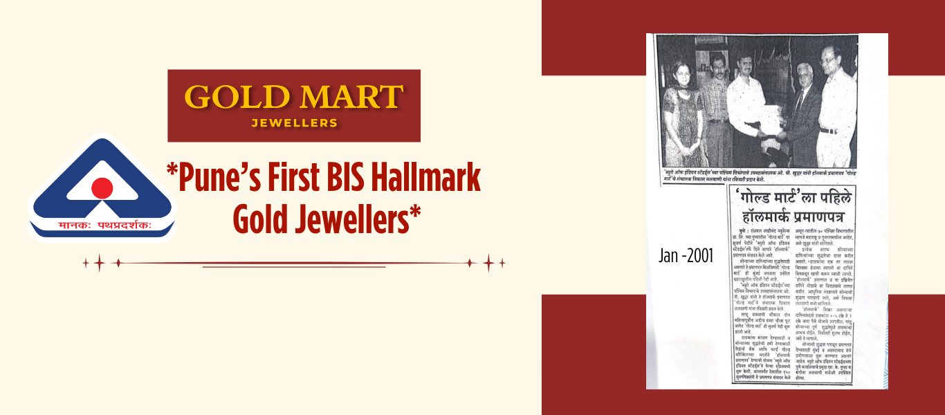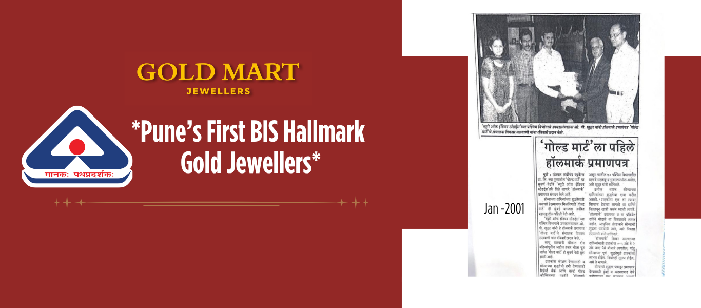 BIS (Bureau of Indian Standards) hallmarking certifies the purity of gold. A BIS hallmark on a piece of jewellery guarantees that it has been tested and meets the purity standards declared (e.g. 22KT = 91.6% pure gold). Gold Mart Jewellers is Pune's first BIS-licensed jewellery store.